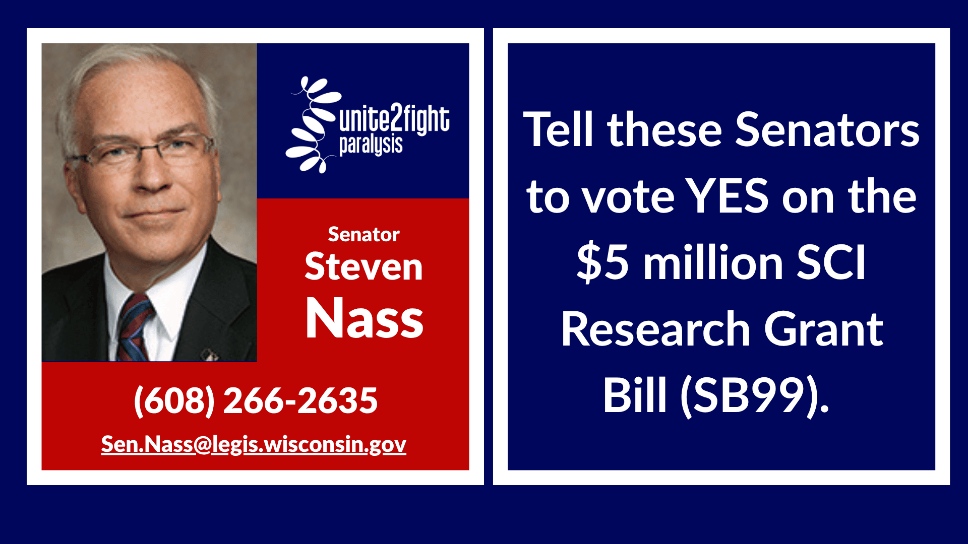 "Please support our Spinal Cord Injury Research Grant Bill (SB99) - which now includes the Jacque Amendment preventing the use of embryonic stem cells. This amendment was added by your Republican colleague, André Jacque, who now supports SB99!"