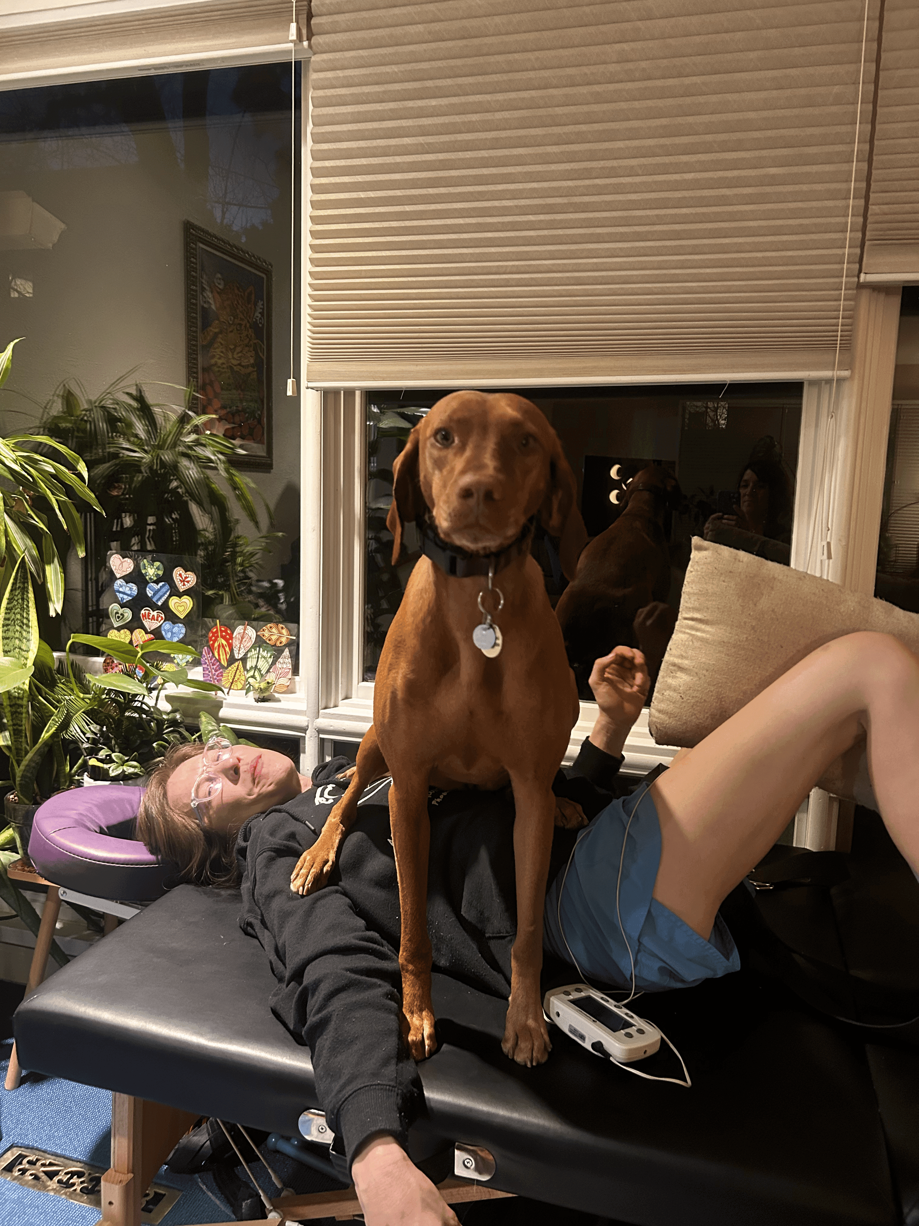 Cedar’s wife Nellie recovering from her SCI, while my dog, Ruby, “helps.”