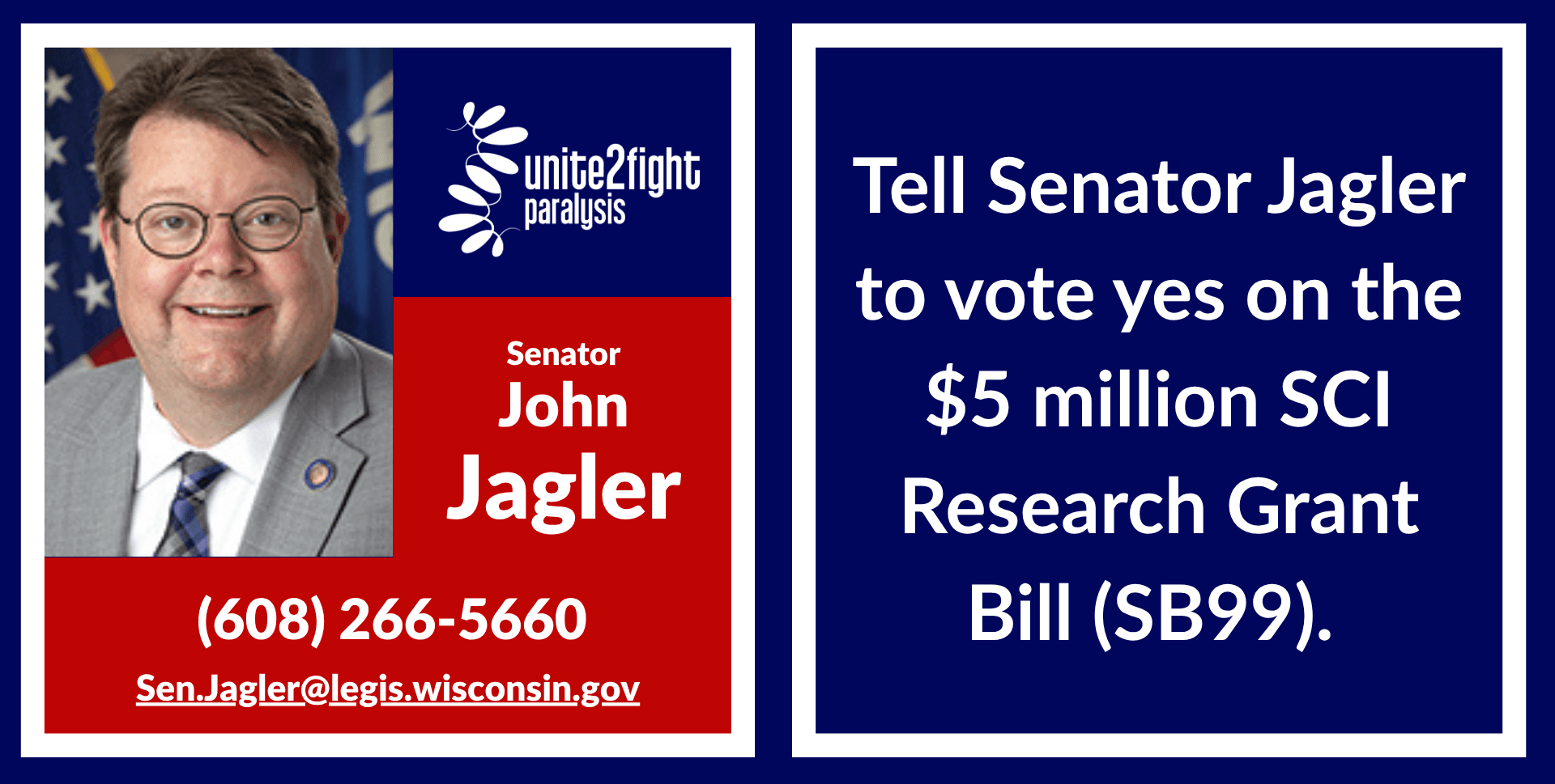 "Sen. Jagler - Please support our Spinal Cord Injury Research Grant Bill (SB99) which now includes the Jacque Amendment preventing the use of embryonic stem cells. This amendment was added by your Republican colleague, André Jacque, who now supports SB99!"